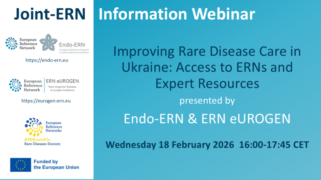 This joint webinar will explore how Ukrainian clinicians and patient representatives can collaborate with European Reference Networks (ERNs) to strengthen rare disease care. The programme will introduce the ERN system, feature insights from Endo-ERN and ERN eUROGEN, and outline how to engage through the Clinical Patient Management System (CPMS).